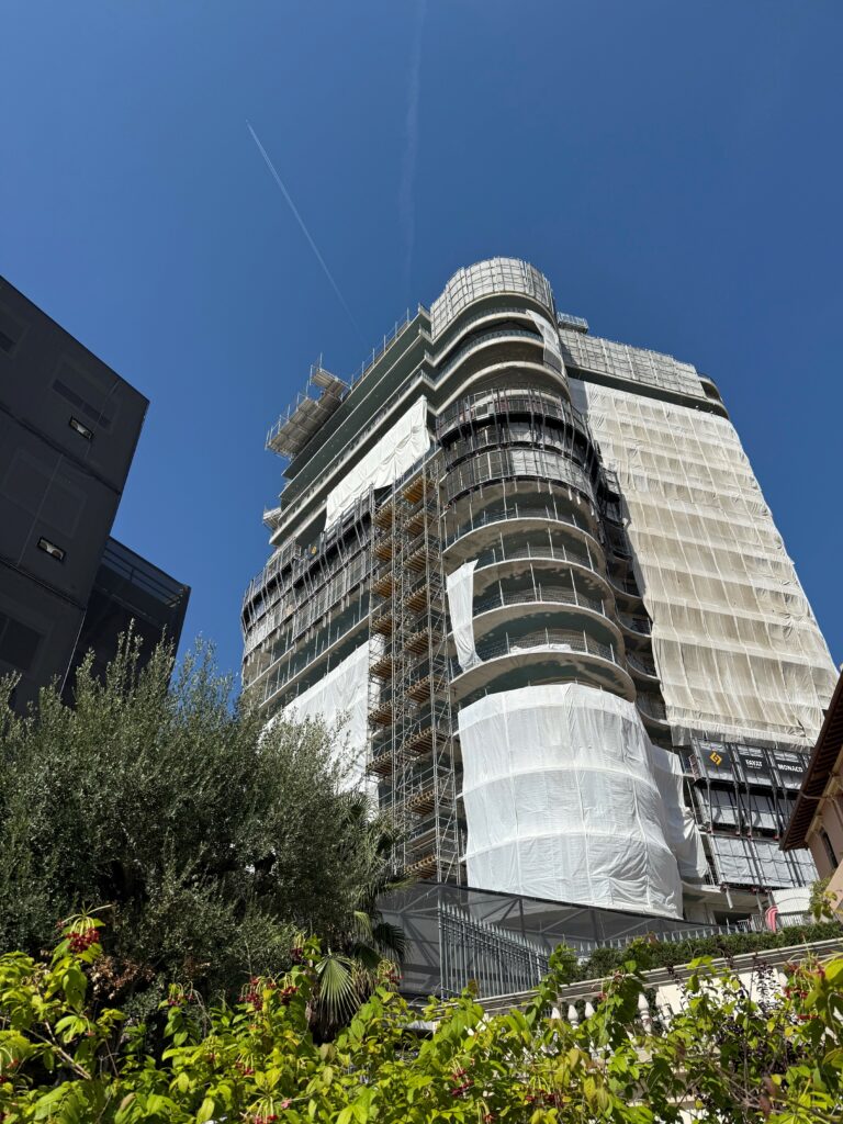 En tête de la tour, la structure complète des trois niveaux de penthouses du bloc C est désormais terminée. La charpente métallique est intégralement montée et le dernier plancher de toiture vient d’être coulé. Les équipes se préparent à reporter leurs efforts sur le bloc B dès la rentrée. Dans les niveaux supérieurs du bloc B, le gros œuvre progresse au niveau 7. Les travaux de plomberie et d’électricité suivent immédiatement, assurés par les corps d’état techniques, avant l’intervention des corps d’état architecturaux.